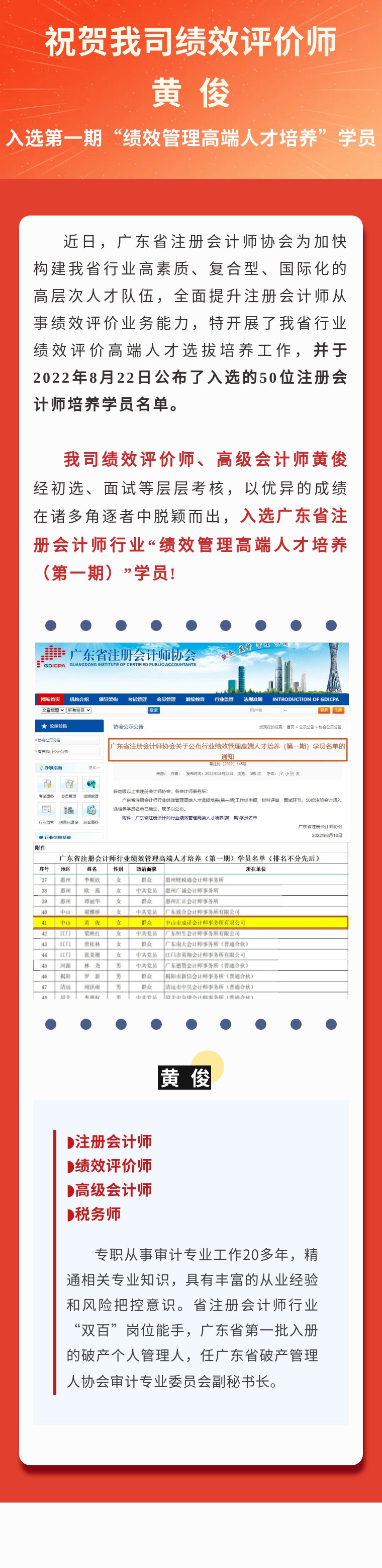 【成諾榮譽】| 我司黃俊入選廣東省注冊會計師行業績效管理高端人才培養(第一期)學員名單